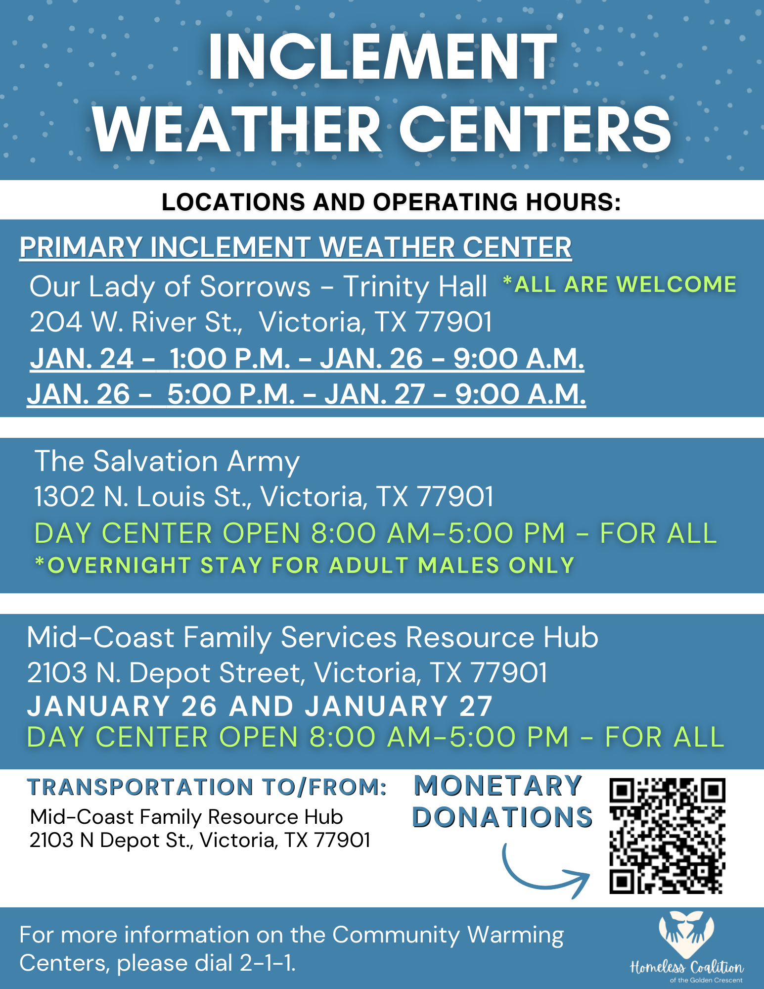 Based on current forecast information from the National Weather Service and established local inclement weather response thresholds, the Homeless Coalition of the Golden Crescent has recommended the activation of Inclement Weather Centers to help reduce cold-weather exposure risks for vulnerable populations within our community.
