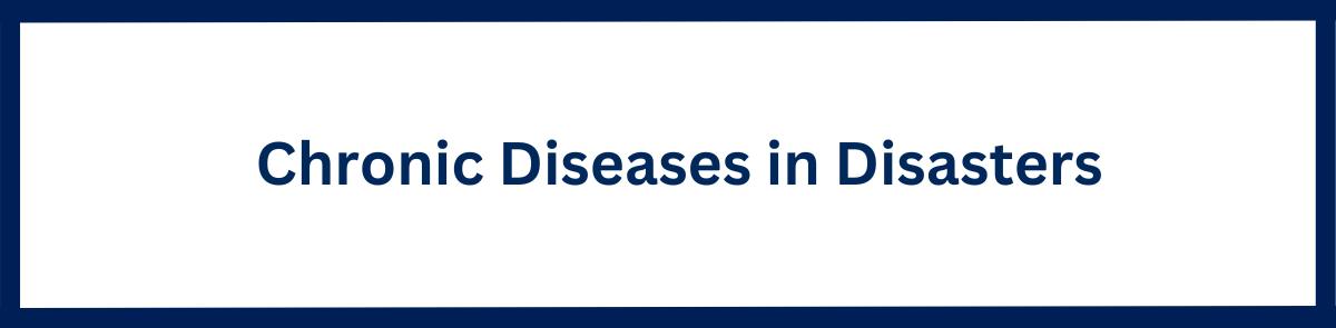 People affected by chronic conditions—such as diabetes, heart disease, asthma, high blood pressure, or kidney disease—may encounter challenges during disasters. Disasters and emergencies can disrupt access to essential services like medications, medical supplies, electricity, clean water, and routine medical care.